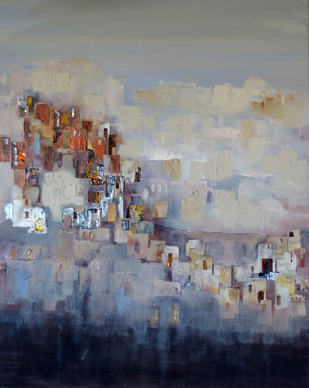 Palette knife and modeling paste mixed with a touch of ochre are used to build up more houses, doorways, windows, bridges and walls in the open spaces. This town on the canvas is now growing like the real Tangier and while working I feel strong energy and also the kind of tension when I´m really into the painting.
